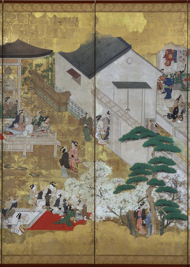 屏風の右側には、劇場の楽屋が描かれています。顔を洗う人、髪を結う人、衣装を身につける人、お茶を点てる人など、舞台の裏側ならではの場面ばかり。さらに左側に目をうつすと、そこは芝居小屋とつながってある芝居茶屋(しばいじゃや)の内部です。楽器の演奏にのって舞を舞う人物、その舞を見ながらお酒を飲む人、桜を眺める人などがあらわされています。ここは、役者が客をもてなす、特別なサロンのようなところのようです。一般の観客が誰でも見ることができる舞台とはちょっと違う空間のようですね。人物ひとりひとりが生き生きと描かれていて、活気あふれる作品です。