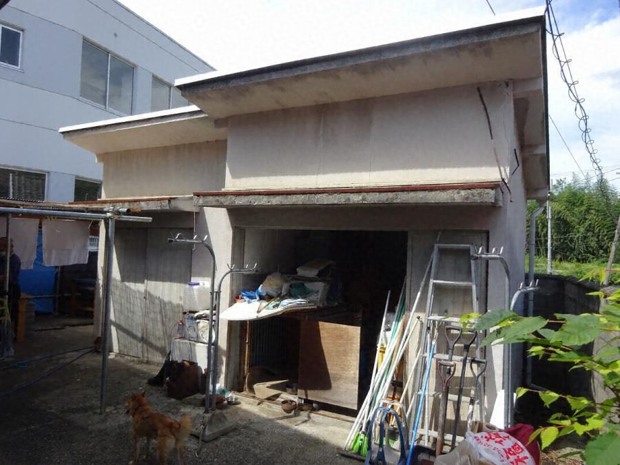 銀行店舗の背面に位置する自動二輪車庫。鉄板葺片流れ屋根の平屋建、外壁はモルタル塗リシン吹付仕上、正面に小庇を付し、引違板戸を立てる。内部は大小2室の土間で、大きい北室を車庫、南室を倉庫とする。形式は簡素だが、当時の銀行営業の様相を伝える。
