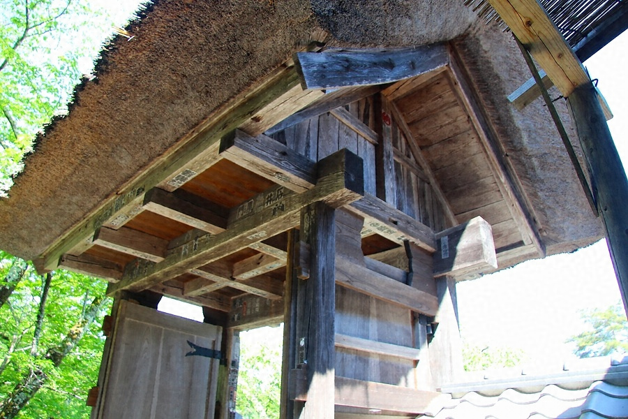 本堂西側の石段上部、三重塔の正面に北面して建つ一間一戸の薬医門で、屋根は切妻造茅葺である。軸部太く、本柱、控柱上部を桁で固め、桁上に梁を四筋架けて持ち出し、先端で軒桁を支持する。木太く、質実なつくりの山門で、古刹の境内の表構えを整える。