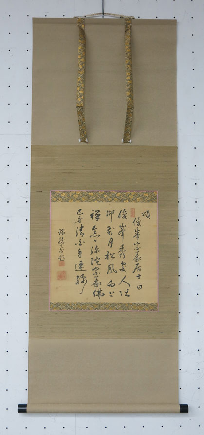 瑞龍寺17世、天外大亮の墨書(七言絶句)である。「頌 俊峰宗義居士 曰/『俊峰秀処人御/卿花月松風白上/禅念々弥陀宗義仏/己身清国自連綿』/瑞龍天外題」。本紙右上の関防印は不鮮明、左下の白文方印「大亮」、朱文方印「天外」がある。俊峰宗義居士については不明。「頌」(しょう・じゅ)は「人の美徳をほめたたえて詩歌にする。功徳をほめる。」の意であるので、天外が俊峰をほめたたえている詩である。表装に淡紅色の筋廻しが施されている。
