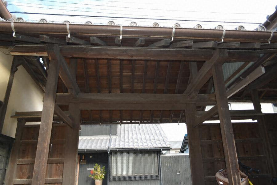 敷地の東面中央、主屋と旧郵便局舎の間に建つ。一間薬医門で切妻造桟瓦葺とする。南北に袖塀がつく。門柱は角柱で冠木を受け、男梁下に小振りな女梁を添える。棟木は撥束で受ける。冠木下に二本溝の鴨居が残り、旧は引戸二枚を建込んだ。宅地正面の軽快な門。