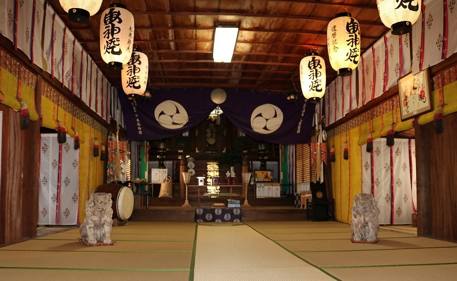 本殿と拝殿の間に位置する中殿及び幣殿。切石積基壇上に建つ両下造銅板葺東西棟で中殿の北・南面に下屋を付し、西に幣殿を延ばす。中殿中央は一室の畳敷で北・南に各2室を配し、東の幣殿は床を一段高く張る。天井は竿縁天井。境内景観に欠かせない社殿。