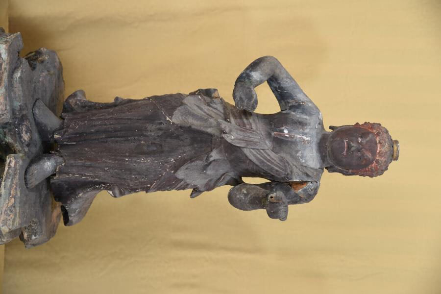 脇侍の不動明王立像と毘沙門天立像はともにヒノキとみられる針葉樹を前後に割矧ぎ、内刳り、割首を施し、玉眼を嵌入したものである。