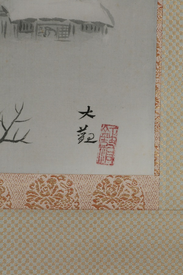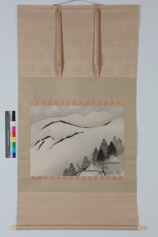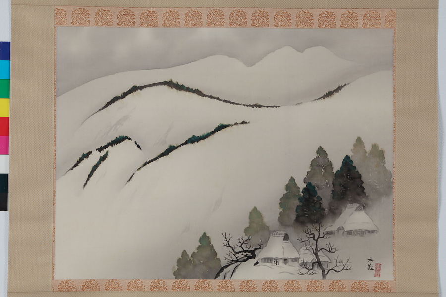大観69歳の作品で、この年の勅題「田家の雪」を画材として本図を作画したものである。