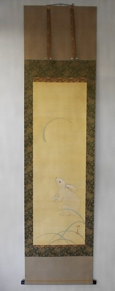 伊藤家愛蔵品。兎が中秋の名月を仰いで夢想する姿を描く。しなやかな筆遣いで、月や秋草の特徴をとらえ、兎の柔らかな質感を表現する。飛鳥時代に中国から月兎伝説が伝わると、満月は「満願成就」、兎は「子孫繁栄」を表す吉祥画題として用いられるようになった。画面右下には、「越堂」の墨署に「越堂」朱文方印を捺す。越堂は明治時代に国民的人気を博した絵師・尾竹三兄弟の長兄。八華会を結成し文展で活躍した。