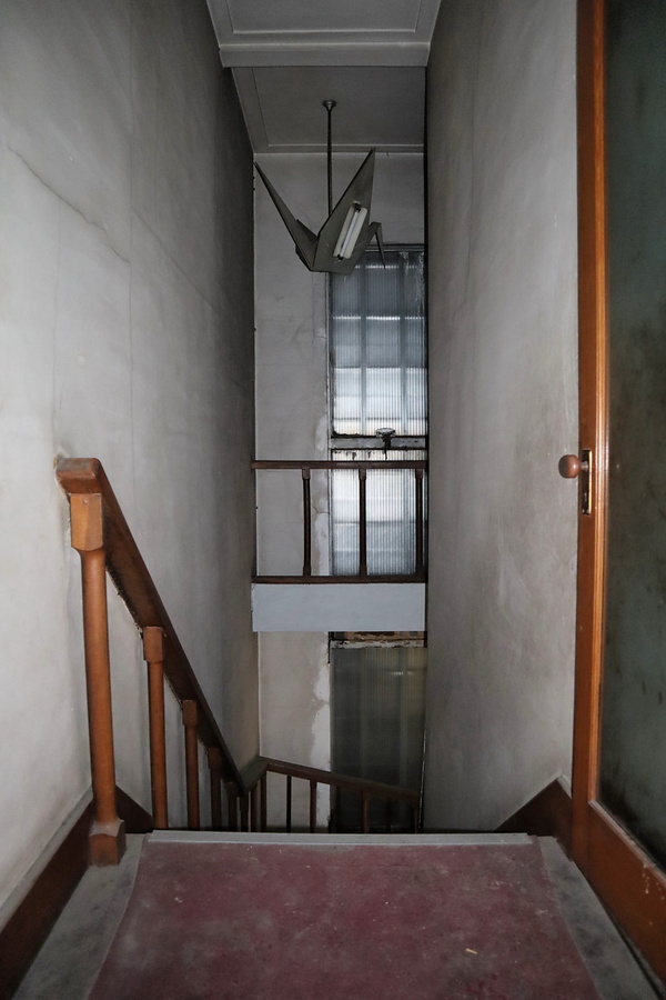 姫路市の中心部に位置し、銀行店舗を転用した旧診療棟。通りに北面する木造2階建で正面西に階段室を張出して大窓を開け、外壁モルタル洗出仕上。一階は診療施設、二階は応接室。階段室に折鶴形照明を吊る。装飾を省いた箱型の外観がモダニズムの影響を示す。