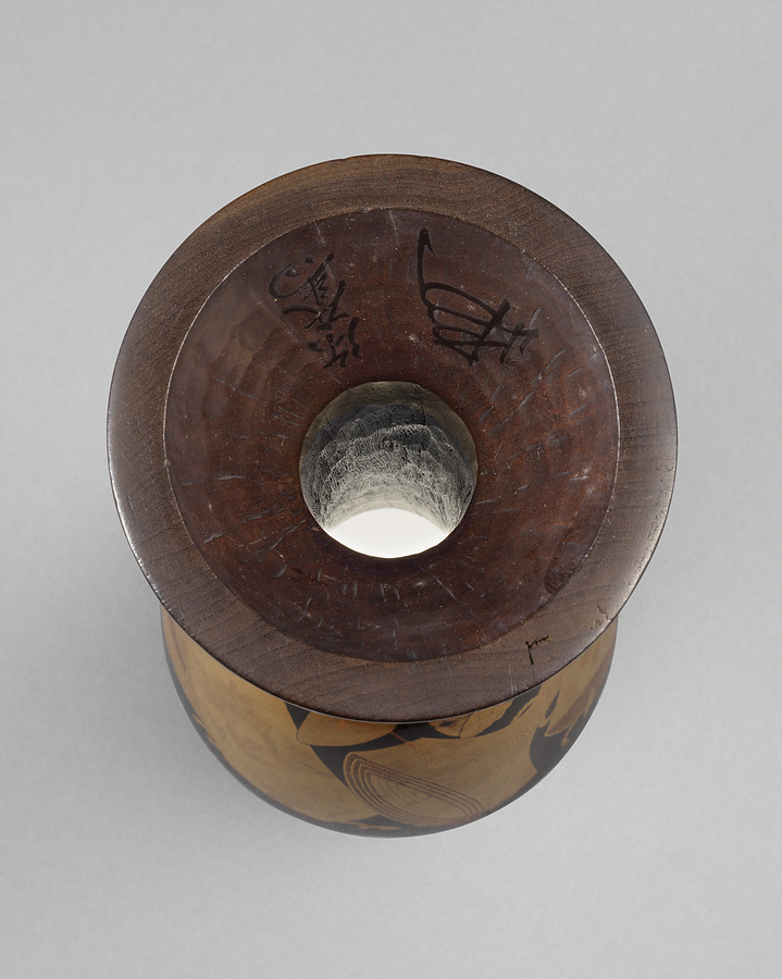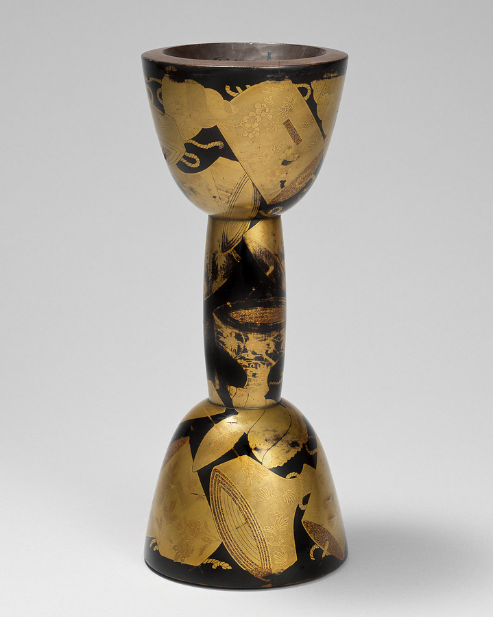 阿古(あこ)作と伝えられる小鼓胴で、請(うけ)には散らしカンナがあり、巣間(すあい)に筋違カンナがある。片方の請に「弥左衛門/(花押)」と黒漆で極書がある。外側は黒蝋色塗地に平蒔絵に絵梨子地を交えて様々な独楽や貝を表す。