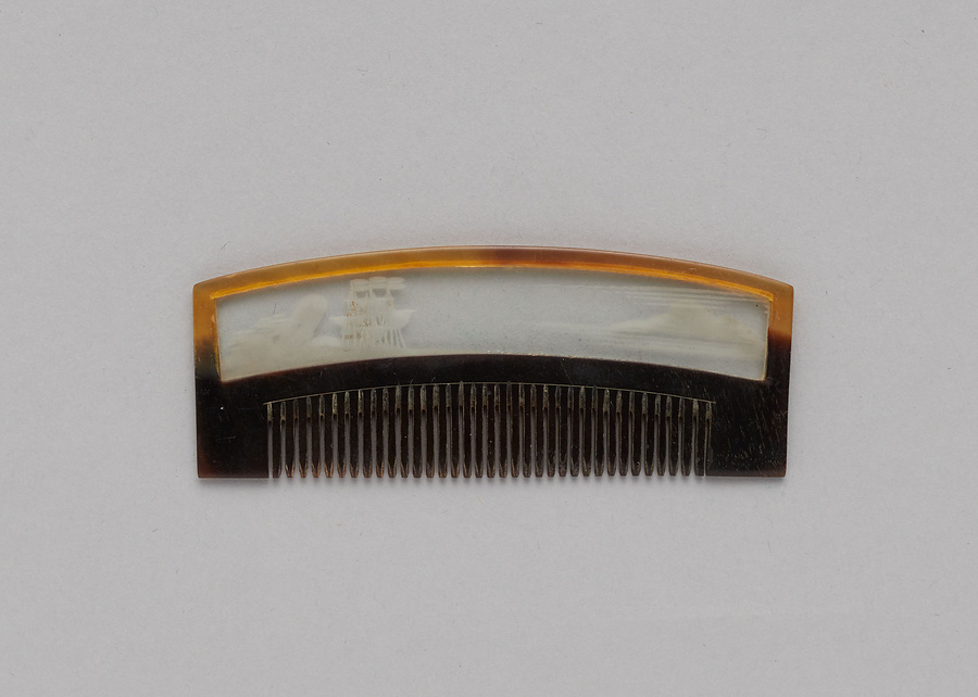 板ガラスを鼈甲に擬した馬爪製の枠で挟み込んだ利休形の挿櫛である。利休形は、『玳瑁亀圖説』によると江戸で寛延・宝暦頃(1748~1764)に大ぶりなものが流行して文化初年までは大きかったが、文政8年(1825)以降に櫛が小型化する中で小ぶりな利休形が流行したとされる。板ガラスには南蛮船と遠山に霞を彫表す。ガラス櫛は「びいどろ」と呼ばれる鉛ガラスで、ポルトガル語やスペイン語に由来する。初めは長崎で作られたものを京・大坂で加工していたとされ、その後江戸で製造するようになって享保末から流行した。花柳章太郎(1894~1965)の旧蔵品で平成15年(2003)に遺族の青山久仁子氏より国立劇場へ寄贈された。