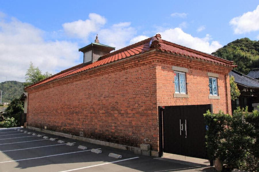 桁行一七メートル梁間五メートル煉瓦造平屋建で、屋根は寄棟造赤色桟瓦葺。中央に塔屋が載る。イギリス積を化粧で現し四隅に柱形を付ける。内部は一室で、位牌棚と通路で構成され、天窓からの光が静謐な空間をつくる。煉瓦造の躯体が境内に異彩を放つ位牌堂。