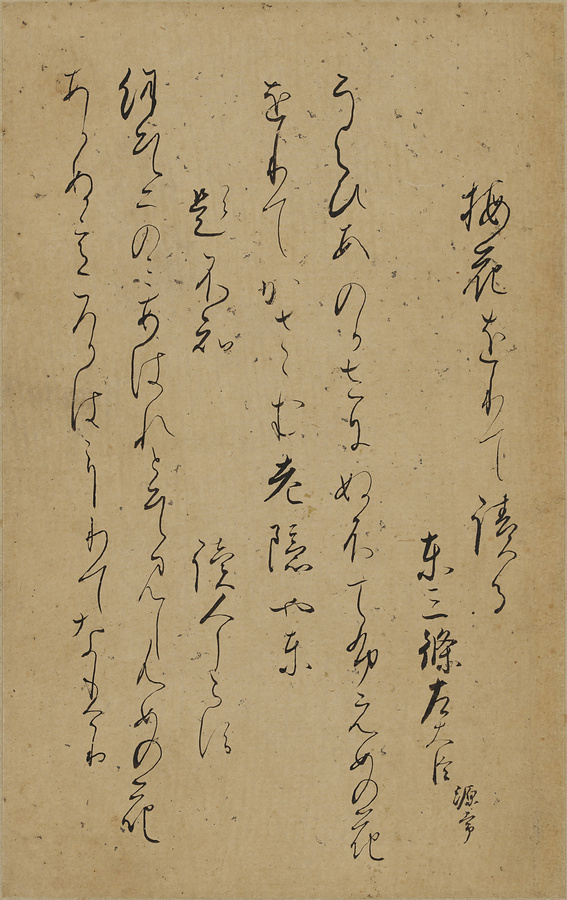 裏面に布目の跡が残る料紙に、『古今和歌集』巻第1の和歌2首を書写した断簡。もとは粘葉装の上下2冊の冊子本。上巻は昭和27年(1952)までは完本として伝来したが、その後分割された。装飾のある紙の表を使用した断簡を「筋切」、紙の裏面を使用した断簡を、篩に似た荒い布目の跡があることから「通切」と呼ぶ。