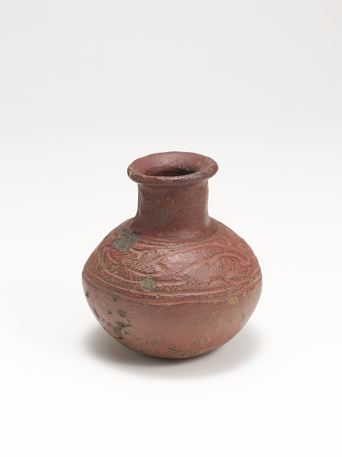 縄文時代晩期の東北から北海道南西部にかけて出土する亀ヶ岡文化の土器。外面には塗布された赤色漆が光沢を保って遺存している。漆工文化は、東・東南アジアに分布し、各地で多様に展開した。その歴史は、日本においては縄文時代早期にまで遡る。しかし、有機物が遺存しづらい埋蔵環境の中で塗膜が明瞭に残る漆製品が出土するのは低湿地遺跡に限られる。通常の遺跡では漆が腐朽し痕跡すら残らない場合や、赤色漆の場合には漆に混和されていた赤色顔料が粉状化して残るのみである。