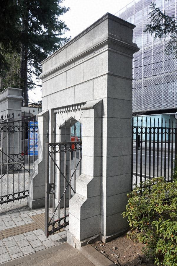 校地北辺中央に位置。三角アーチの脇門二基を一対とした正門。鉄筋コンクリート造洗出に目地切りで石張にみせる。間口は四・二メートルで両開鉄扉を吊る。脇門はコーニスやデンティルで飾り、十字架にTGを重ねた校章を付す。歴史ある私学の表構えを形成。