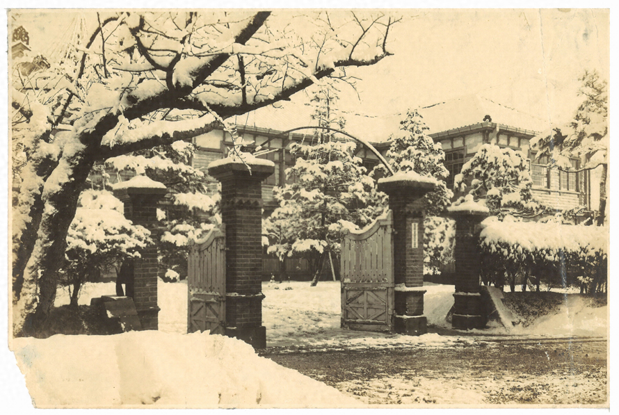 富山県立高岡高等女学校の雪景色の写真である。門柱の表札は「富山県立高岡高等女学校」と読み取れる。同校は『富山県写真帖』(明治42年、富山県)に、「明治四十年の創立にして高岡市の西方射水郡横田村に在り生徒二百九十六名あり」とある。しかし、下記によると、同42年高岡市横田町(現県立高岡西高校敷地)に、北陸一の設備を誇る新校舎が完成とあり、この新校舎の写真と思われる。