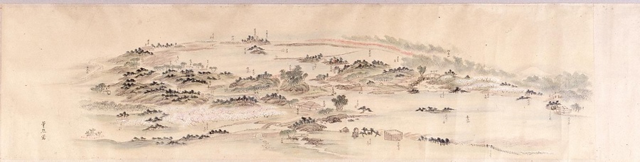 浴恩園は、松平定信(まつだいらさだのぶ)が築地の白河藩下屋敷内に造園した庭園である。一橋家の屋敷地を譲り受け、隠居所として整備した。庭園は、江戸湾の海水を引きこんだ「春風の池」と「秋風の池」の周辺に、各季節の植物を植え、季節ごとに草花を楽しめる回遊式(池の周りを巡る)庭園であった。当資料の景観年代(描かれた庭園の時代)は寛政年間(1789~1801)と思われる。