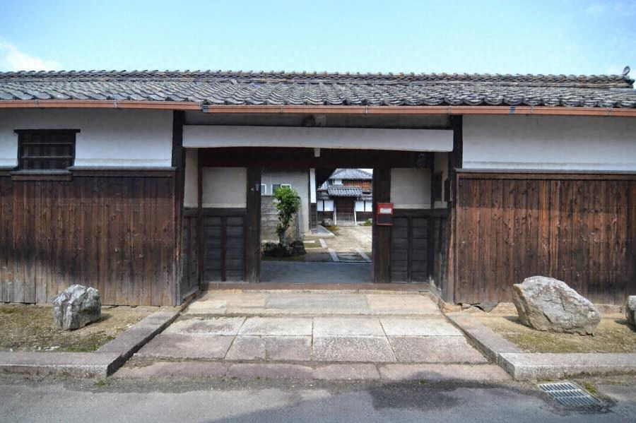 かつての環濠集落の旧家の長屋門で、敷地北東角に東面する。切妻造平入桟瓦葺、中央二間を袖壁付門口とし、引分け板戸を立てる。南北の室は物入れ。門口のまぐさや桁を漆喰で塗込める特徴的な意匠。窓が少なく閉鎖的な門構えで、集落の歴史的景観を形成する。