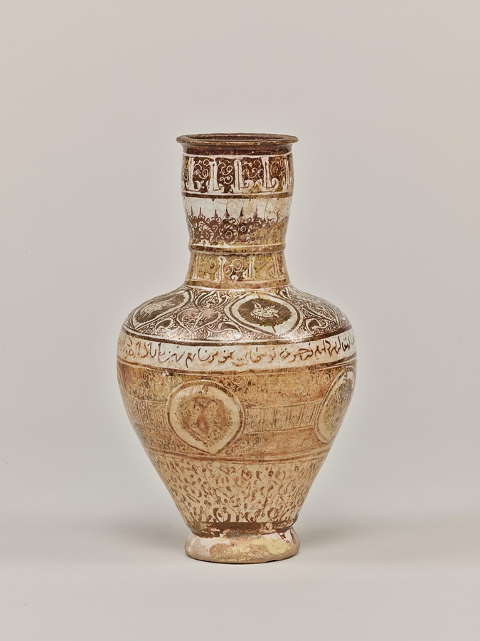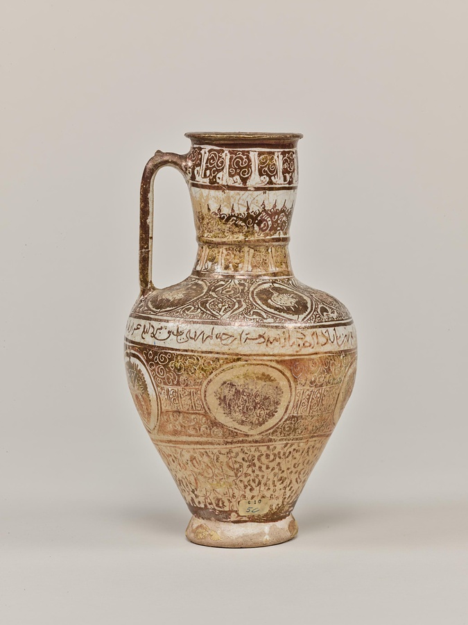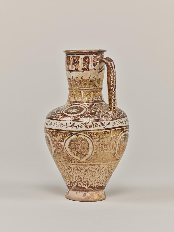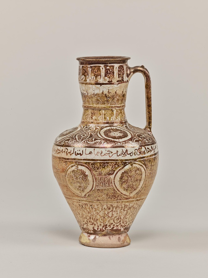 頸が長く、肩が張った水差の器面全体を覆うようにラスター彩で装飾されています。口縁、頸、肩、胴、裾とそれぞれに異なる文様帯が設けられ、さらにラスター彩の上から掻落としで蔓草のような装飾が細かくほどこされており、手の込んだ作行きをみせています。