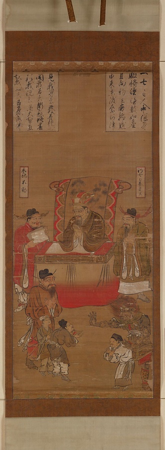仏教には、人が亡くなると、生きていた時の罪について十人の地獄の王の下で裁きを受ける、という考えがあります。その王たちの裁判の様子を描いたのが十王像です。亡くなった日を1日目として、49日目までの7日ごとに秦広王 (しんこうおう)、初江王(しょこうおう)、宋帝王(そうていおう)、五官王(ごかんおう)、閻魔王(えんまおう)、変成王(へんじょうおう)、太山王(たいざんおう)が裁きを行い、それでも結論が出ない場合は、100日目に平等王(びょうどうおう)、1周忌に都市王(としおう)、3回忌に五道転輪王(ごどうてんりんおう)が裁判を行います。このような過程を経て、亡くなった人が極楽浄土に行くのか、それとも地獄に行くのかが決まると信じられていました。