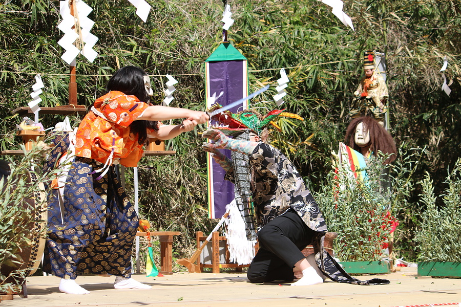 演目には日本神話に基づく物語、獅子舞や、御返閉に見られるような西島の神楽特有の神楽舞が数多く含まれる。