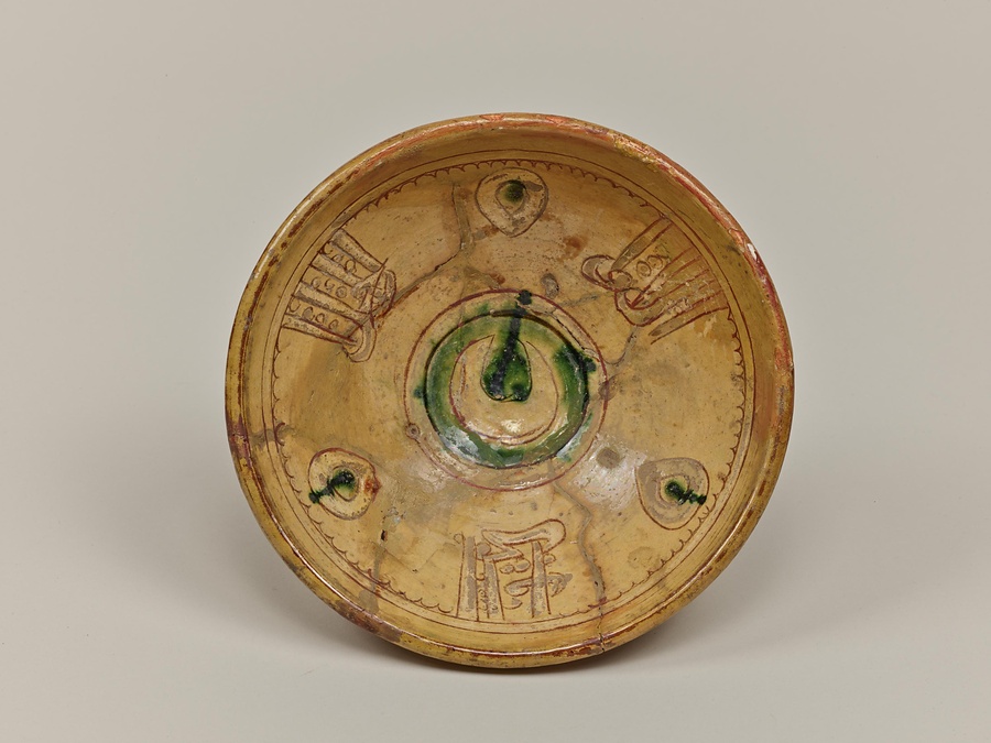 黄釉白堆刻文鉢