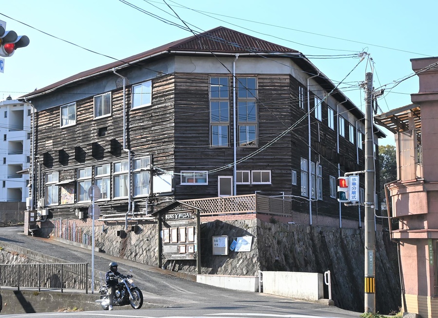 呉港東の高台に建つYWCAの会館。敷地に合わせたV字平面で2階建切妻造鉄板葺、外壁下見板張。隅切部に縦長窓を開けて吹抜ホールとし、踊場付階段で二階へ上る。二階床の合成梁など特徴的な構法を用い、角地に建つ洋風の外観が地域のランドマーク的存在。