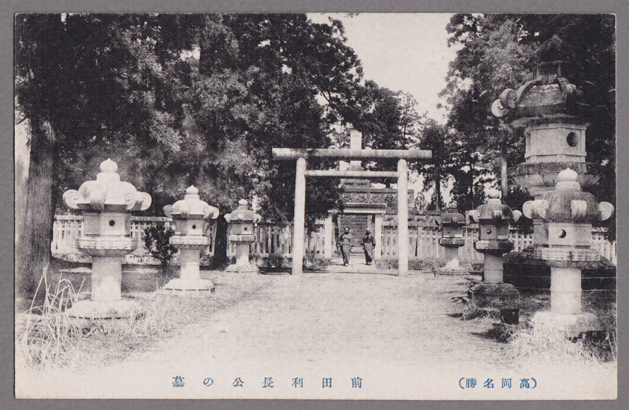現高岡市関にある前田利長公の墓を撮影した写真絵葉書である。下部に右読みで「(高岡名勝)前田利長公の墓」とある。