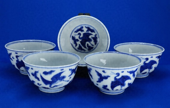 伊藤家愛蔵品。流れる雲の中を飛翔する鶴を描いた京焼の煎茶碗。素焼きした白い素地に呉須で絵付をし、透明釉を掛けて本焼きしたもの。高台内に筆で「華中亭道八」の銘を描く。鶴は古来、「不老長寿」の瑞鳥とされてきた。雌雄が一生を連れ添うことから、「夫婦円満」に通じる文様としても知られる。三代道八は仁阿弥道八の長男。仁和寺宮から法橋の称号を授かる。明治2年、佐賀藩に招かれ有田焼の技術指導を行う。