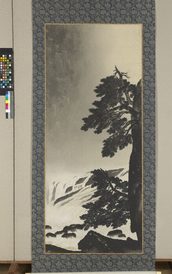 大正15年4月、宮内省より六曲一双屏風と双幅掛軸揮毫の御下命があり、昭和3年6月、大観は《飛泉》(双幅掛軸・皇居三の丸尚蔵館蔵)を宮中に納めた。本作はその右幅の未完本である。