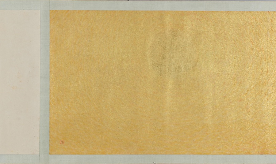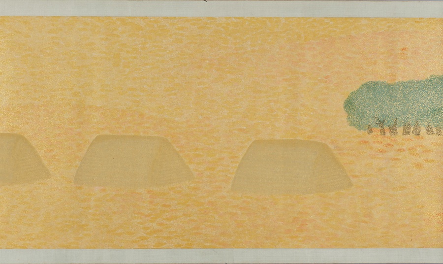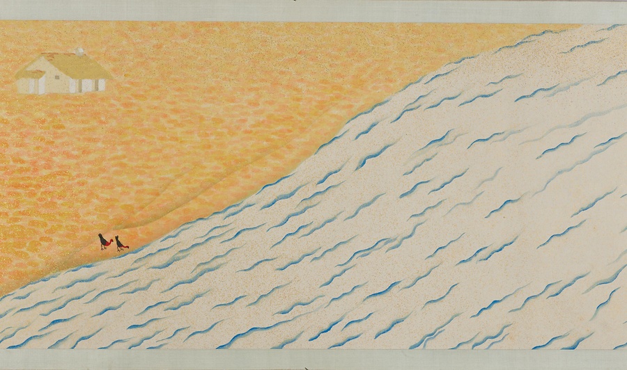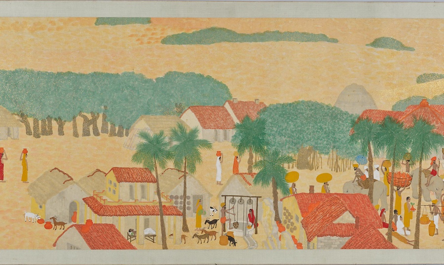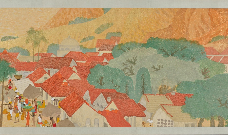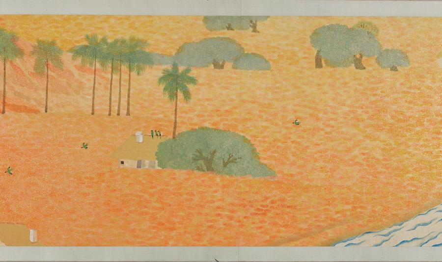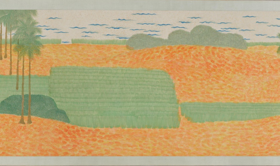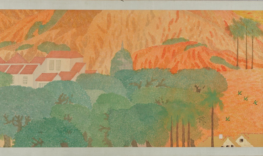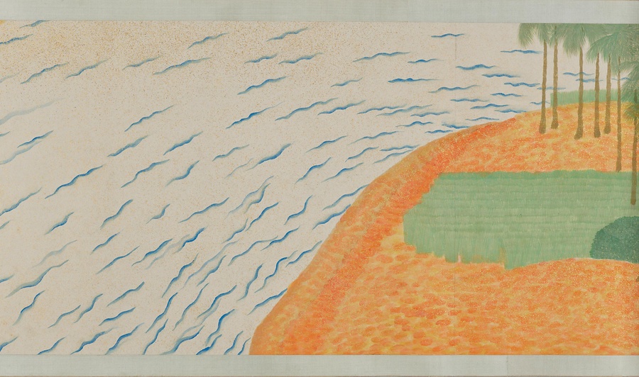 いかにも南方を思わせる自然や建物、暮らしを営む人々のすがたが、10メートル近い巻物に展開しています。日本の伝統的な絵画の形式、材料、技法にのっとりながらも、異国情緒あふれる主題、明るく強い色づかいと金砂子による光の表現、単純化されたモチーフや点描をもちいたタッチなどが、強烈な印象を与えます。
