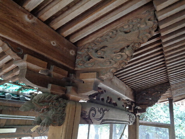 内部に本殿を安置する桁行三間梁間二間、入母屋造桟瓦葺、正面一間向拝付の覆屋。正側面に擬宝珠高欄付の縁を廻らし、脇障子を建てる。身舎組物は出組で妻飾は虹梁大瓶束。向拝の虹梁形頭貫廻りや手挟などを彫刻で飾る。本格的な本殿形式の構成になる覆殿。