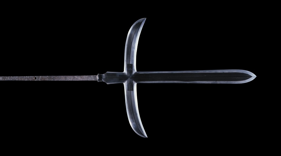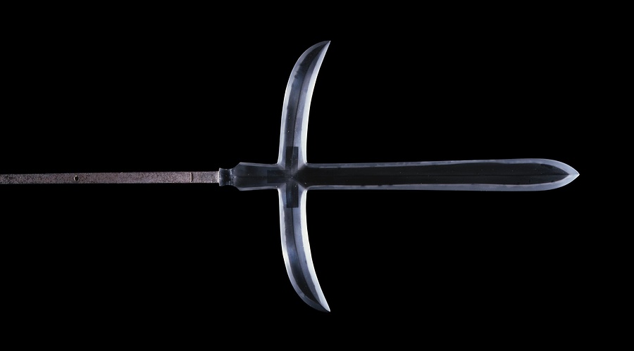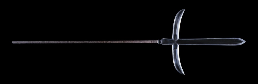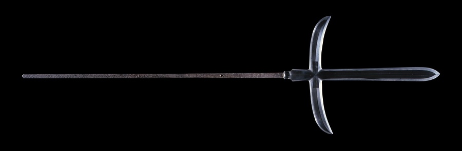 槍は長柄@ながえ@武器の一種で、室町時代後期に合戦での主要な武器となりました。本品は美濃@みの@国(岐阜県)関@せき@で活躍した兼常の作です。直槍@すやり@の両脇に鎌をつけた十文字槍で、板目@いため@が流れて征@まさ@がかった地鉄@じがね@に尖@とが@り刃@ば@を交えた直刃@すぐは@調の刃文@はもん@を焼入れており、関@せき@鍛冶の特徴がよく示されています。