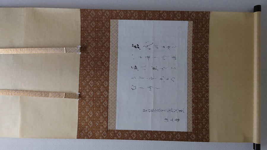 庄内酒井家9代酒井忠德は、藩政改革を断行したり,藩校を創設するなど名君と称され、歴代藩主の中でも傑出した歌人、能書家であった。この古歌は、現在、日本国歌の歌詞であり、元来は平安時代に詠まれた、作者不詳の和歌である。他の忠德の書と違った端正な書風の作品である。酒井忠徳は京都の堂上派歌人冷泉為泰・日野資枝らを師として和歌の修養につとめ、忠徳に宛てた大量の書状が残され、京都歌壇と地方歌壇の関係がよく分かる。同様に天明年間から文化年間にわたり約20年にわたり真田幸弘公等と親しく交わり俳諧を楽しんでいる。貴重な文芸(点取俳諧)資料が残されている。