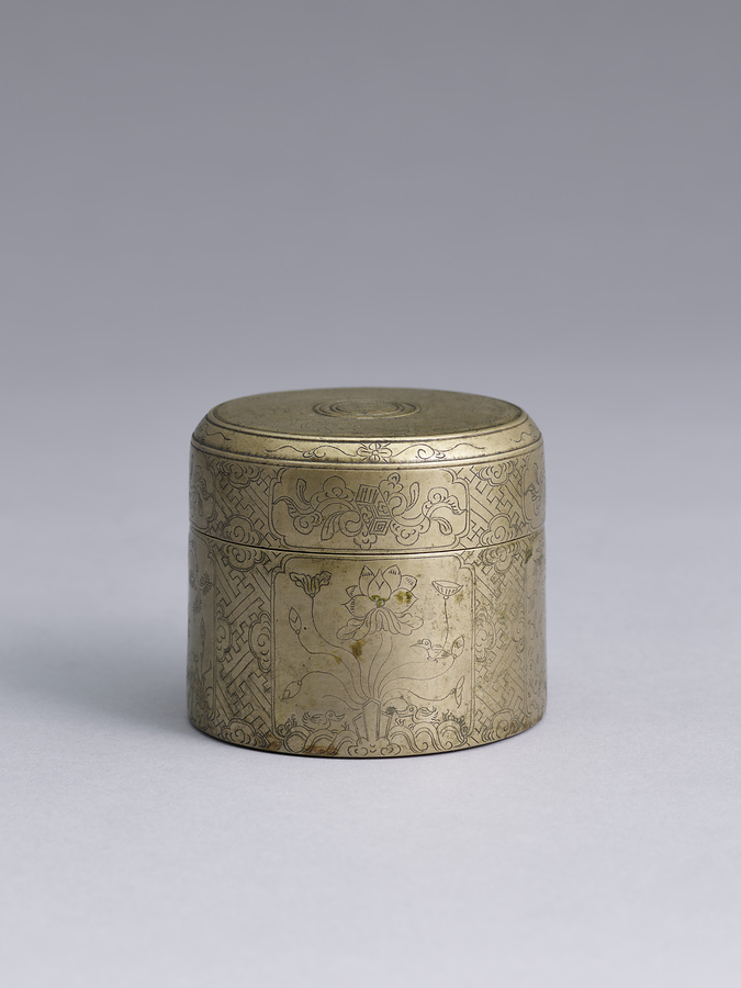 真鍮鋳造、彫金。東南アジア各地では檳榔と呼ばれるヤシ科の常緑樹の果実を薄切りにしたものに石灰を塗り、蒟醤の葉で包んで噛む習慣がある。ベトナムでもこの習慣は極めて古くから行われており、現在ではやや廃れつつあるものの、喫茶習慣が中国系移民によってもたらされるまで檳榔噛みはベトナム社会に欠かすことのできないものであった。本品は、檳榔の果実と蒟醤の葉を入れるための専用容器である。檳榔噛みは、ベトナム最後の王朝である阮朝では極めてひろく流行し、本品のような比較的安価な金属で製作されたものから特注の王族用金製合子まで存在する。被せ蓋に懸子1枚という構造は素材の如何を問わず通有のものであり、表面を吉祥文で埋め尽くす点も共通する。