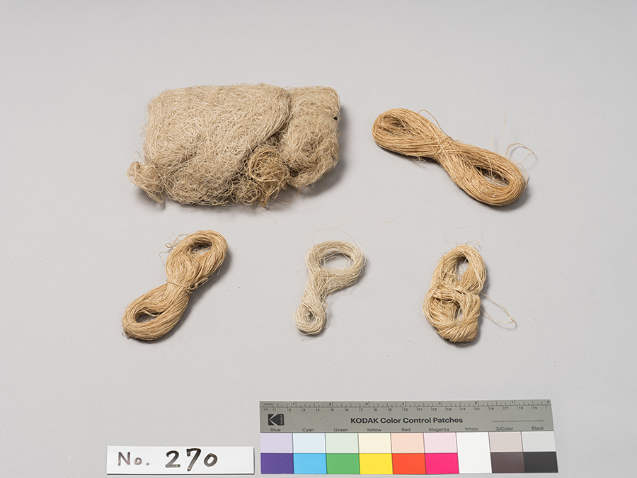 苧(カラムシ)を編んで糸にしたもの(ノキイト)このように8の字形にすることを、テガラニトルという。小量の糸を出先で績んで持ち帰る時などの整理方法で、苧も8の字にすることがあるがこれもテガラという。