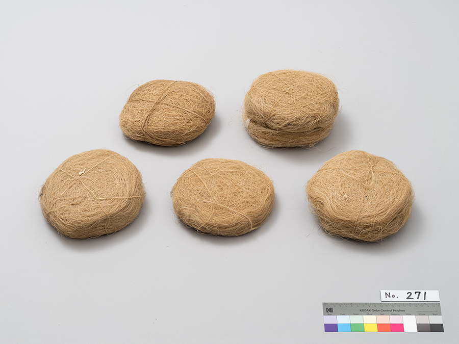 ウミソの一定量を写真のように束ねるが、こうしたものをツヅネという。績みためておく時、または、このまま売り渡すような時に、このようにくくっておいた。