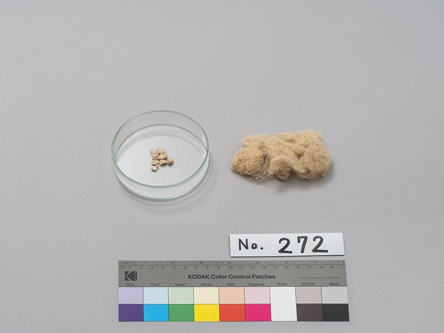 オウミの折に出るクズ。歯でケバなどを掻きとるので口の中に残る。これをオブケのカケゴの中にはき出しておく。乾いてから保存しておき、ウチワタにして綿代用に用いた。資料番号:4001(画像左)、4281(画像右)