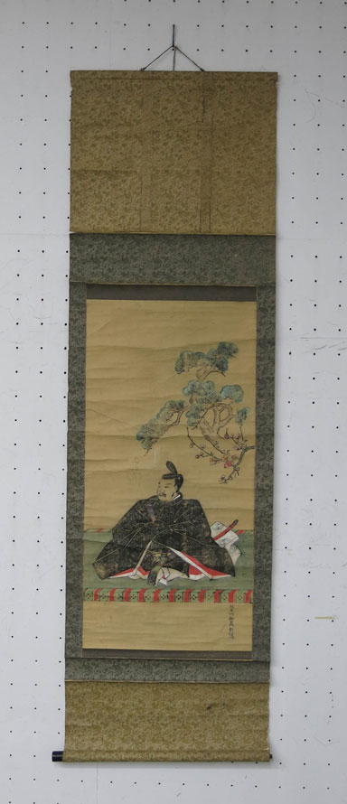 繧繝縁の上畳に座す束帯姿の天神を描く。向かって右後ろに松と梅が描かれる。左上には賛「千里飛□ 西溟伝徳香風標/何所以□ 立朝庭」及び落款「梅堂拝書」、印章(白文方印「□□」)がある。梅堂は不明。本紙中央左折れ、上部に破れ、汚れ、折れなどあり。左上部、右上部破れあり