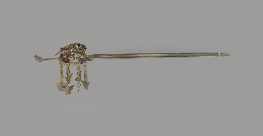 銀製、二本足の歩揺簪で一対(200と201)揃いで伝わる。牡丹と梅の飾りは蕊に珊瑚を付け、蝶の歩揺飾りが下がる。歩揺簪は寛政年間に流行し、鎖の先に蝶や鳥・小鈴などを付けて、歩くたびに揺れ動いて音がするようにしたもので、主に上流階級で用いられて華美を極めた。文化・文政頃に江戸で廃れ、その後上方でも廃れて文久頃には全く絶えたとされるが、実際には近年まで作られ、使用されていた。花柳章太郎(1894~1965)の旧蔵品で平成15年(2003)に遺族の青山久仁子氏より国立劇場へ寄贈された。