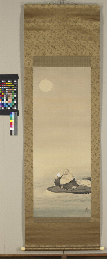 本作では、満月と、それを愛でる布袋が描かれる。月と布袋の間には漠然とした空間がひろがり、淡い地塗りがほどこされている。これが観る者に想像の余地を与えると同時に、空気、光の存在を表現しており、「朦朧体」と呼ばれた表現の片鱗をみることができる。