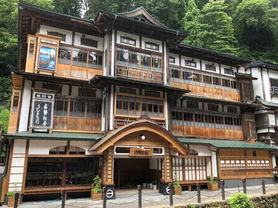 銀山温泉街の銀山川北岸に所在する木造三階建温泉旅館。入母屋造銅板葺で各階に庇を巡らす。一階表通り側に浴室を設ける当地旅館の典型。客室は元は床構え付和室を並べる。玄関及び塔屋状の構えと、銀山川を望む二・三階の縁は歴史的温泉街の風情を形成する。