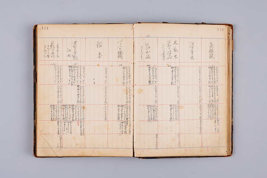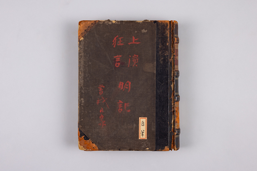 表表紙には黒の背景に赤字で「上演狂言明記」とあり、背表紙には「一堺漁人脚本台帳10 曾我廼家五郎蔵書」と記されている。作品ごとに上演地(大阪、京都、東京、名古屋・神戸、其他と分かれている)と年月・劇場名を記したもの。作品名のすぐ下の数字は上演時間だろう。過去の作品を上演するために選ぶ際、新作の上演時間との兼ね合いで見繕うのに役立ったはずだ。