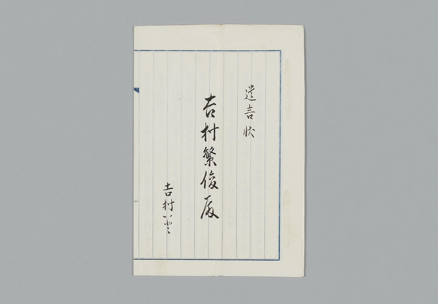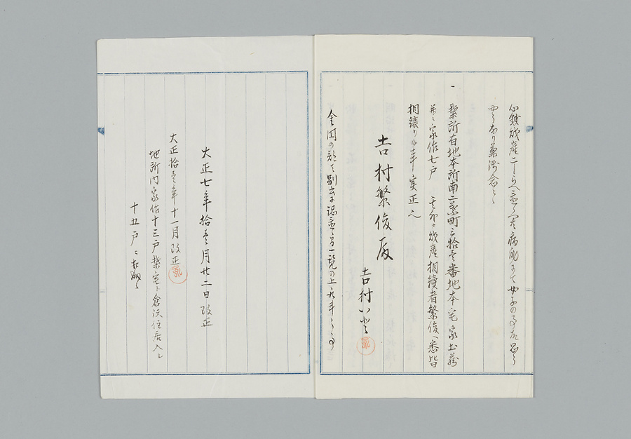 大正7年(1918)11月22日改正、大正11年(1922)11月改正とある。黙阿弥の長女「吉村いと」から養子の「吉村繁俊」へ宛てた遺言状。吉村家の先祖代々と黙阿弥、その妻・琴、次女の島女、13歳で夭折した三女のます、「此四名の仏を大切」に回向すること、本所の本宅を相続することが記され、糸女の黙阿弥家への思いが伝わる。