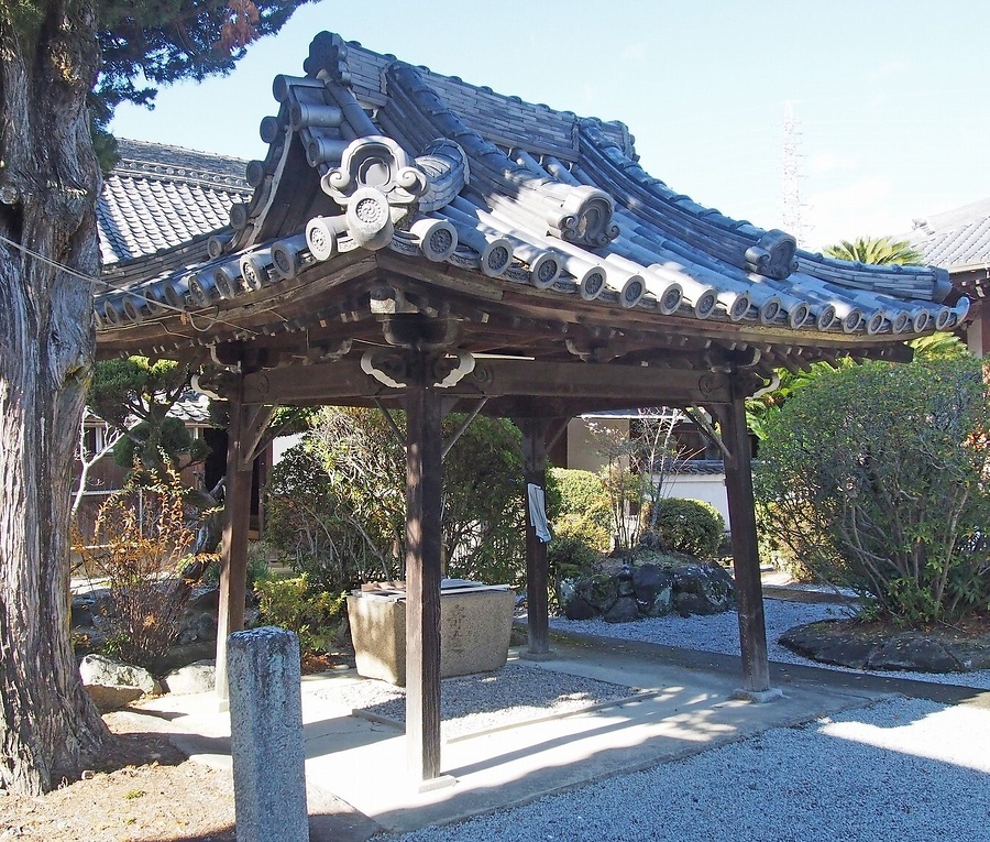 本堂の南に位置する手水舎。入母屋造の本瓦葺南北棟で、角柱を四方転びに立て、虹梁形頭貫で固め、組物は大斗肘木の詰組、軒は二軒吹寄垂木とする。柱間を吹放し、土間中央西寄りに水盤を据え格天井を張る。小規模ながら降棟を付すなど重厚な屋根の手水舎。