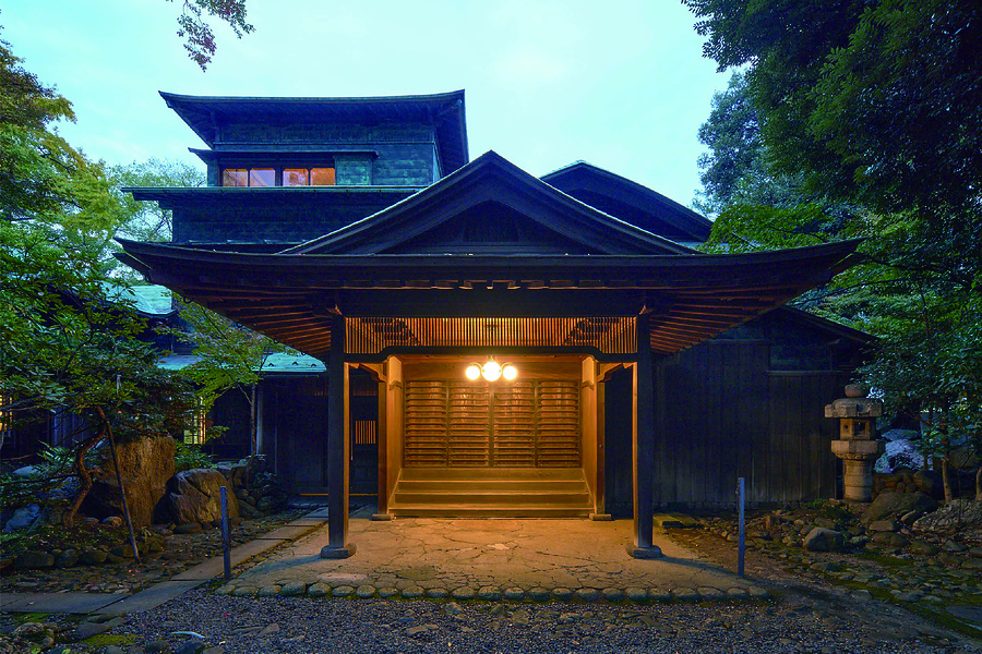 主屋は、明治42年(1909)に着工し、大正元年(1912)に竣工した。車寄を備えた平屋建の書院棟、三階建の応接棟、平屋建の旧台所棟などから構成される。屋根は銅板葺で、外壁にも銅板を張るなど、外観に大きな特徴をもつ。建築材料には、吟味された国産の良材がふんだんに用いられている。棚や天井、建具、欄間などの造作や意匠、また狂いのない塗壁からは、当時の高度な木造建築技術の一端をうかがうことができる。施主は、「山林王」と称された実業家・磯野敬(1868〜1925)。棟梁は、当時二十代の若さであった北見米造(1883〜1964)が務めた。その後、「石油王」とよばれた中野貫一(1846〜1928)の所有を経て、大谷哲平(1907〜1998)の所有となった。平成17年(2005)に国の重要文化財に指定され、現在は公益財団法人大谷美術館が管理している。
