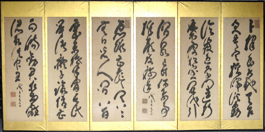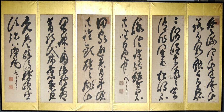数ある屏風の内容は全て、中国唐代の禅僧・寒山の『寒山詩集』収録の五言律詩(5字×8句=40字)から、適宜8句選んで揮毫されている。本資料の内容は、右隻(左右の順は便宣的なもの)は注1高田氏論文(p53~54)の(二)と(四)、左隻は(三)と(七)の漢詩がそれぞれ第1~3扇と第4~6扇に書かれている。左右隻共、第1・4扇右上には関防(引首)印「屏風千双為需臨済宗/法灯派本山越中州国/泰寺五十四世越叟禅/師山岡鉄舟居士書」(朱文方印)、及び第3・6扇には落款「鉄舟居士書」と印章〔朱文方印「山岡鉄/太郎印」、白文方印「荷葉団々々/似鏡菱角/尖々々似錐」(注4)〕がみられる。