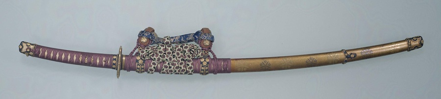 糸巻太刀は柄@つか@と鞘@さや@を糸で巻いた太刀拵で、江戸時代には大名などの高位の武士が儀式の際に佩用@はいよう@し、贈答や奉納にも用いられました。本品は「太刀 福岡一文字貞真」に付属するもので、鞘と金具には本品が伝来した久留米藩主有馬家の家紋である笹龍膽車@ささりんどうぐるま@紋が飾られています。