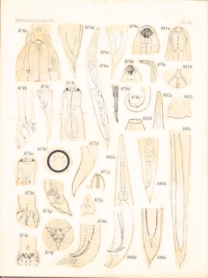 Fig. 875. Oesophagostomum eurycephalum Goodey, 1924. a. Head, lateral view. b. Head, end-on view. c. Anterior extremity, ventral view. d—e. Posterior extremity of male. f. End-on view of anterior end of esophagus. g. Posterior extremity of female.