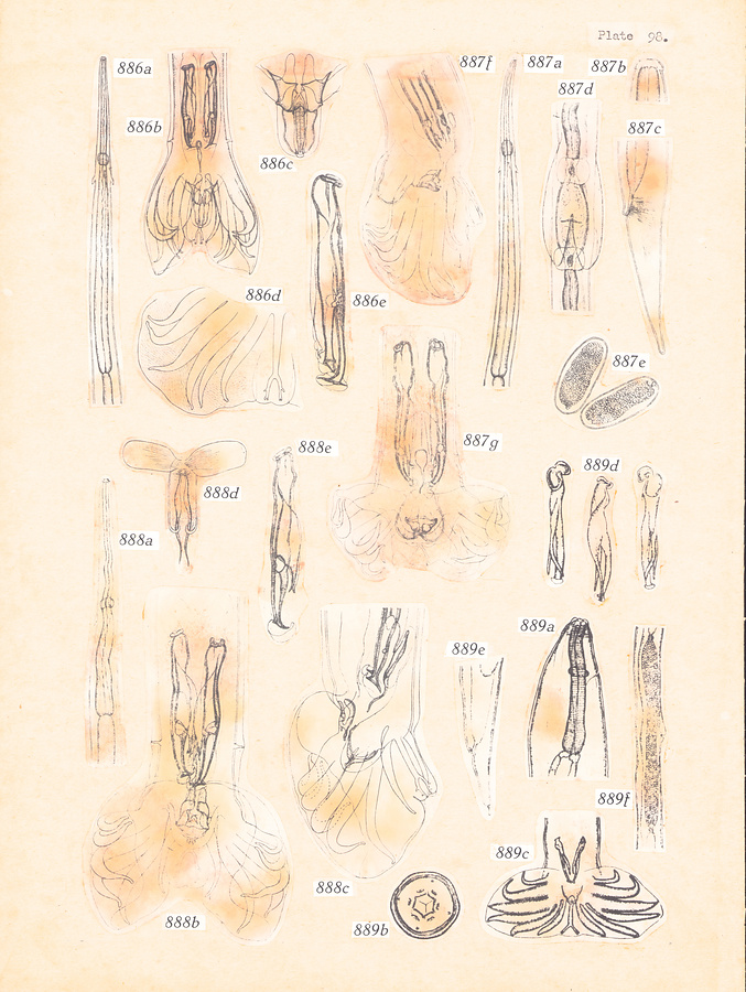 Fig. 864. Protofilaria furcata Chandler, 1929. a. Posterior extremity of male. b. Female terminalia. c. Posterior extremity of female.