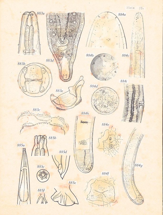 Fig. 831. Wellcomia hilgevti (Seurat, 1914). After Seurat in Yorke and Maplestone, 1926. a. Anterior extremity, ventral view. b. Posterior extremity of male.