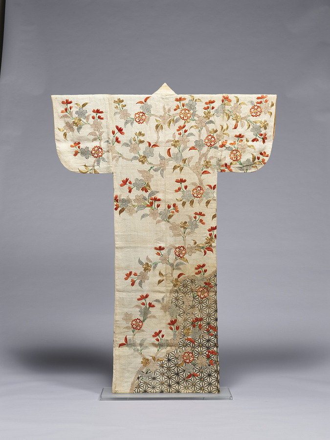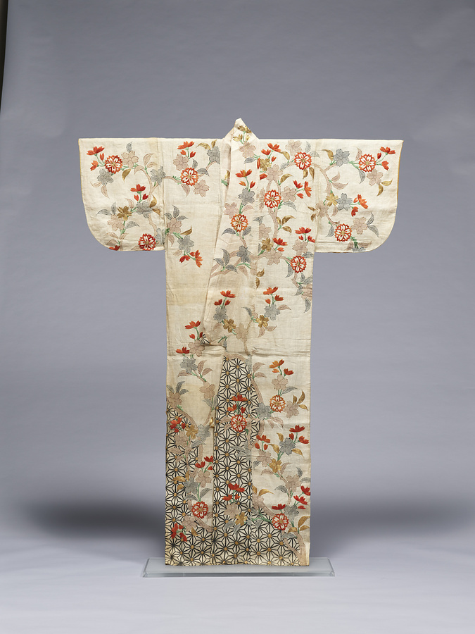 白麻地に桜の立木を表した江戸中期の帷子。本品のような麻による単の夏向きの衣類を帷子という。本品のような立木文様は、寛文期以降盛んに作られた文様である。また右裾にみられるような、文様の輪郭線を色や文様の境界線として用いる表現は、万治頃から多用されるようになるが、元禄の頃には見られなくなる表現である。一方、鹿子絞りをはじめとした絞り染めや金糸の刺繍といった高価な技法の流行は、風紀を乱すものとして度々奢侈禁止令が出され取り締まられ、天和3年(1683)に出された禁令では惣鹿子と金糸の刺繍が禁止された。これを受けて町方では、鹿子絞りを模した型鹿子(摺匹田)を始めとした型染めが流行するようになった。本品には絞り染めの使用が見られないことから、天和の禁令以降の作と考えられ、貞享(1684-88)から元禄の初期頃の作と思われる。