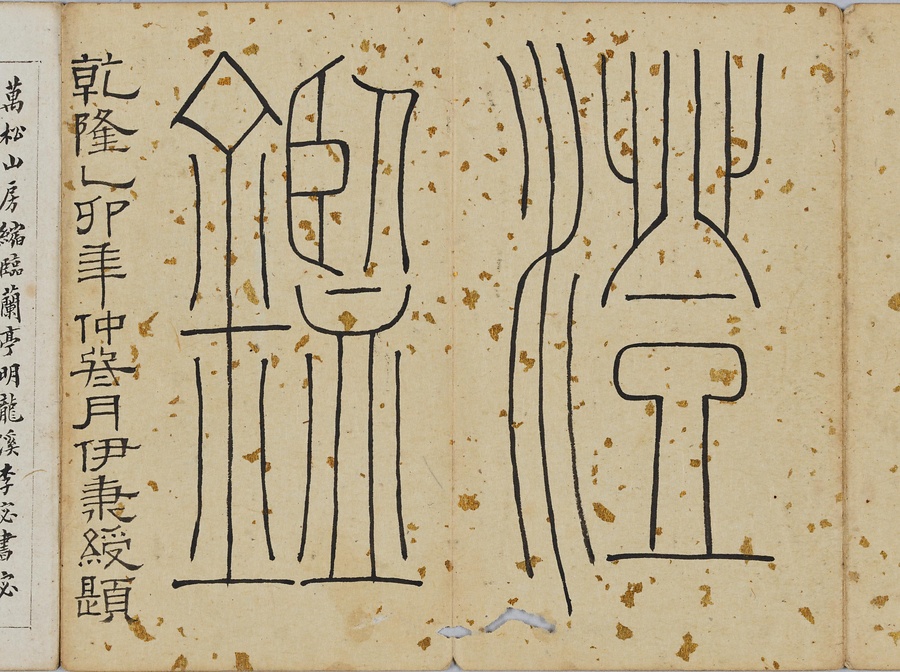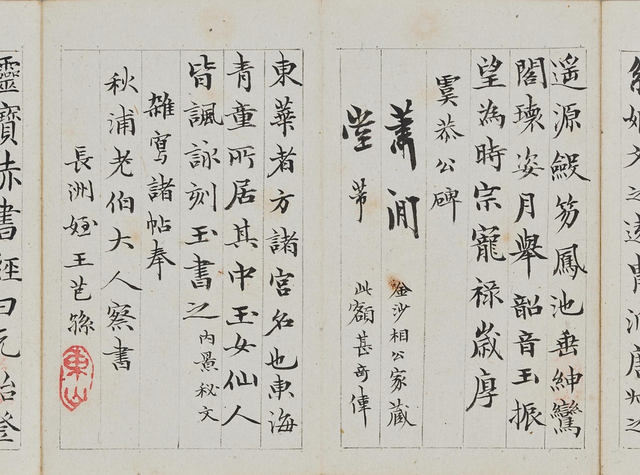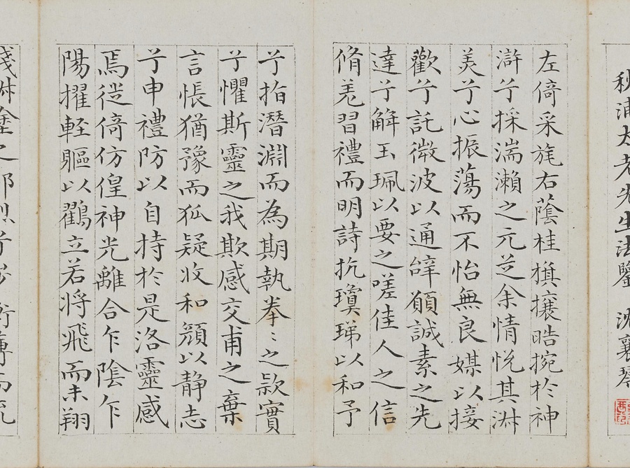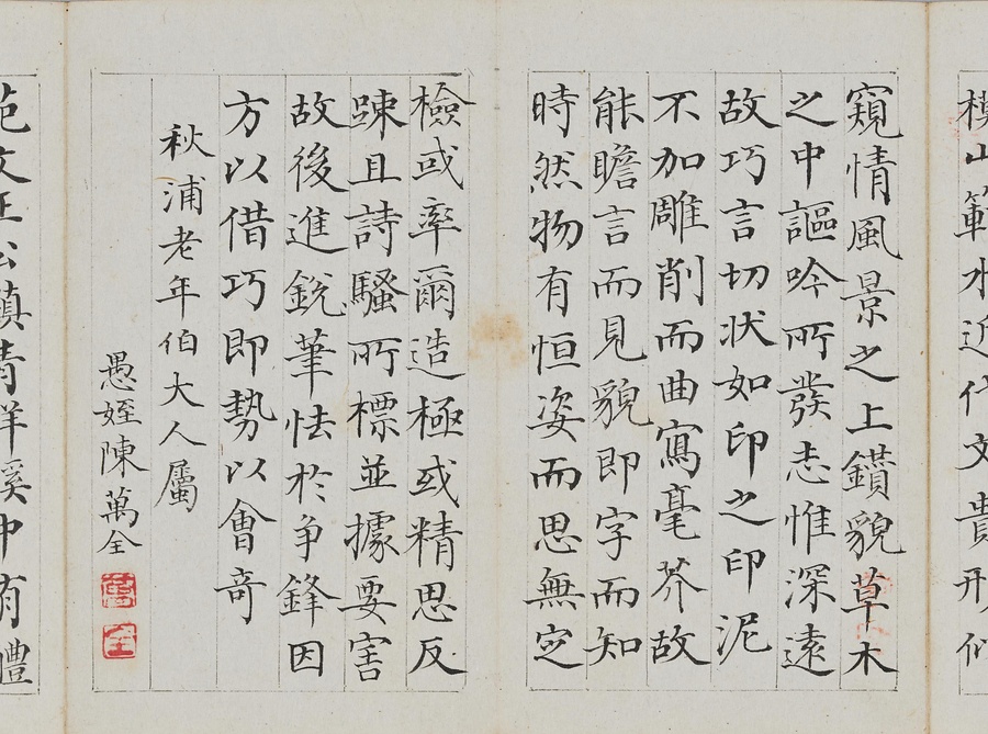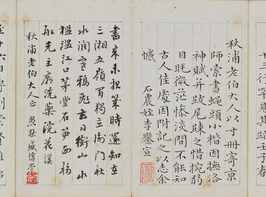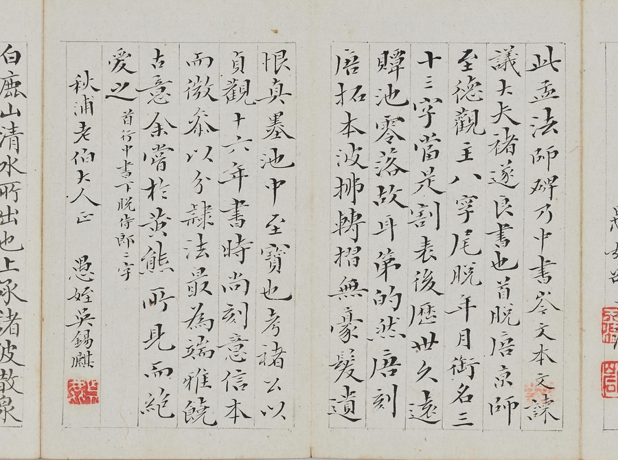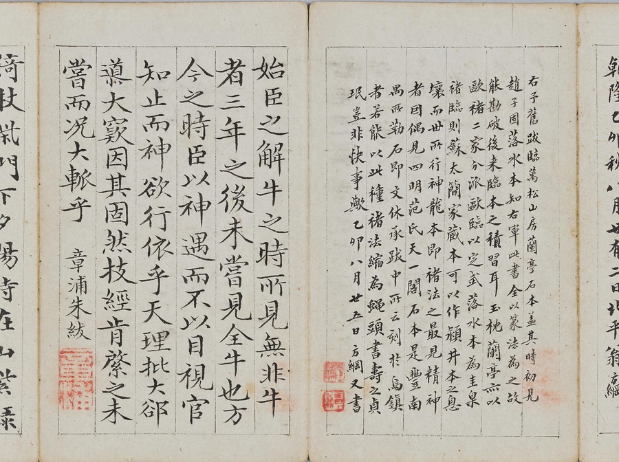 乾隆@けんりゅう@期の文人23名が秋浦@しゅうほ@という者のために、碑帖の臨書や様々な文章を書き継いだ1帖。蠅@はえ@の頭のような極小の書で、印も特製でしょう。学界の重鎮の翁方綱は縮小臨書の蘭亭序@らんていじょ@とその刻石に関する文章を記し、能書@のうしょ@の伊秉綬@いへいじゅ@は王羲之@おうぎし@ら晋唐名家の法帖を臨書します。碑帖は文人の交流に欠かせないものだったのです。